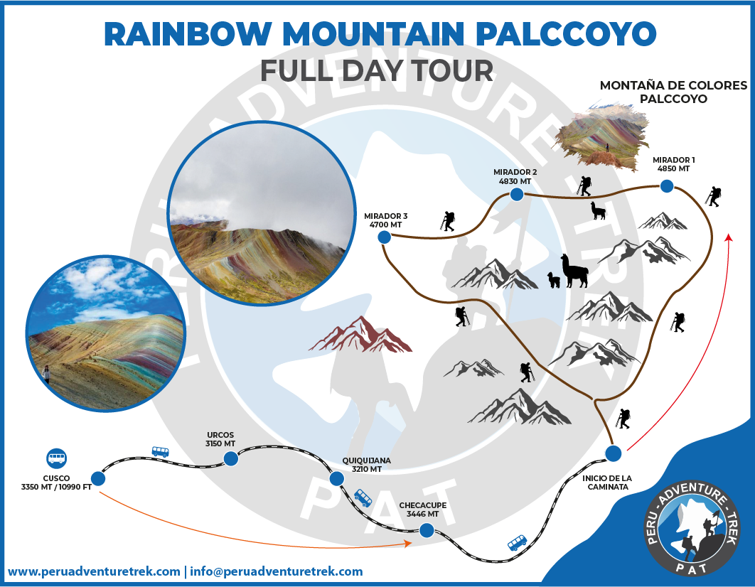 Pick up from the hotel will be from 4:30 to 5:00 a.m. Once together with the whole group we will head south of Cusco, our first stop will be in Cusipata, in this place we will have breakfast. Then we will continue our trip until we arrive to Abra Huallata Cunka in the community of Palccoyo, which is located at 4100 m. a. s. n. m., at this point we will be able to observe three colorful mountains. Once ready we will start walking for 1 hour visiting the Cordillera Palccoyo and the forest of stones. After the tour we will return to the city of Cusco, on the way back we will have lunch in the town of Cusipata, arriving to Cusco approx. 5:00 pm.