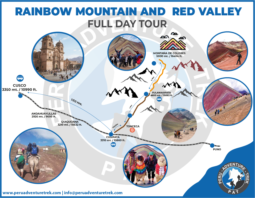 arriving to Phullawasipata at 4200m/ 14,300ft. From here the hike begin uphill for two hour and until you reach the Rainbow Mountains. Upon reaching the top of the 5100 meters above sea level, on the way you see glacial peaks, red mountains, rocky hills, and traditional llamas and alpacas grazing along the valley, when you reach the top of the mountain at 5038 masl, you will be able to enjoy breathtaking views of the Andes and the Andean fauna.