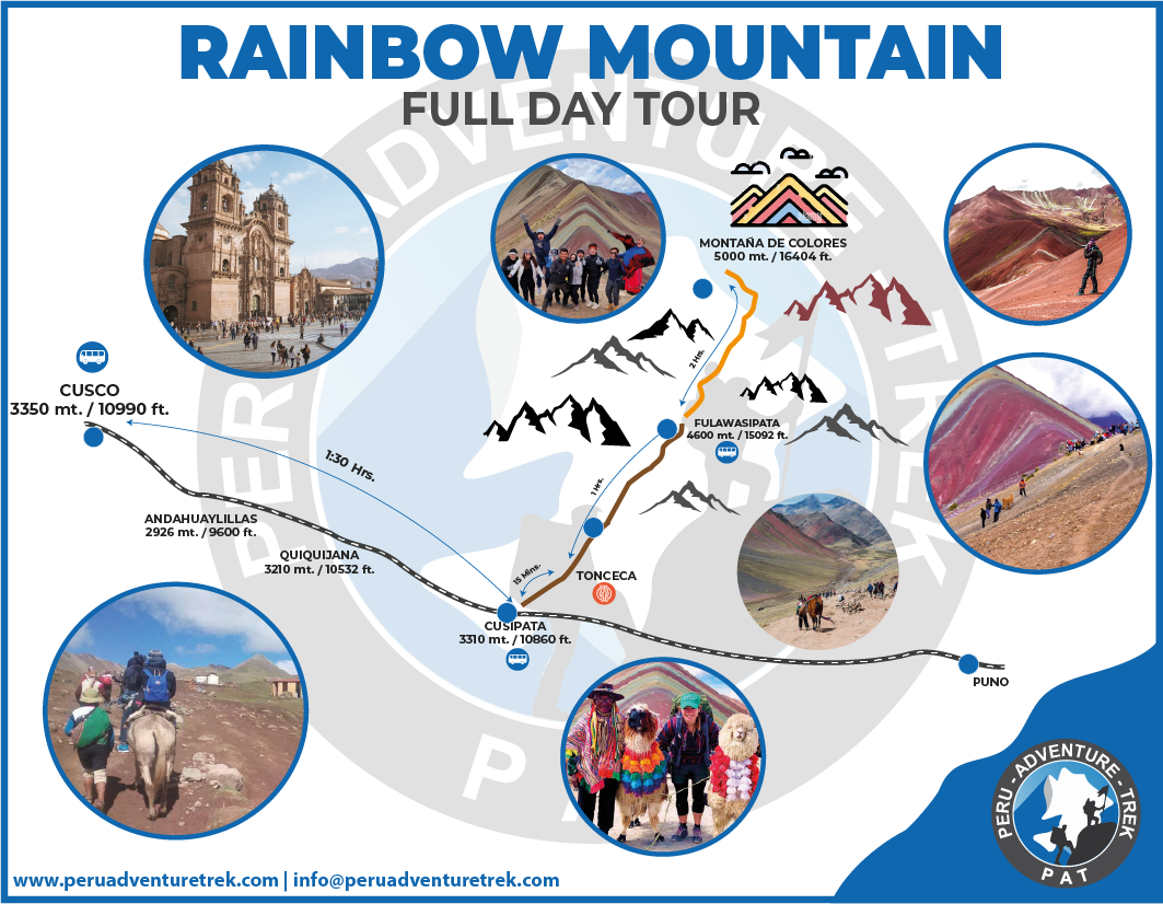 Our staff will come to pick you up at 4:30 am to your respective hotel, we will board our private transportation and then head to the town of CUSIPATA, during the trip we will pass through different villages and enjoy the incredible views of the Peruvian Andes, the trip is approximately 2 hours. Upon arrival we will make a stop to enjoy a delicious breakfast and stock up on some things necessary to start the tour. After this short stop, we will continue our trip where we will observe the landscapes, the mysterious mountains and the deep valleys. We will arrive at the town of CHIHUANI at 4800 meters above sea level. From here we will start hiking uphill for 1 hour and a half until we reach the Rainbow Mountain. Upon reaching the top of the mountain at 5100 m.a.s.l., you will be able to enjoy breathtaking views of the Andes and the Andean fauna, all the mountains surrounding this area are red in color and there are impressive views of the valleys and the mysterious 7 colored mountain (Rainbow Mountain), where we will have enough time to take pictures and videos. After the great experience we will start the return hike, in a duration of 50 minutes, then we will enjoy a delicious lunch. Later we will return to Cusco, we will be arriving to the city at 4:30 PM approximately, thus culminating the tour to the mountain of 7 colors.